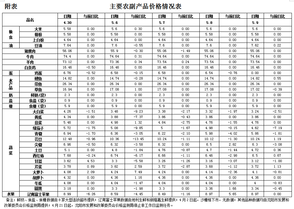 沈阳市重要生活必需品市场监测情况专报(5月9日)